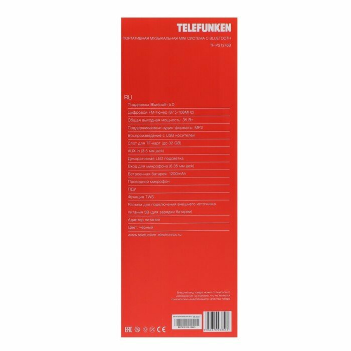Портативная акустика TELEFUNKEN TF-PS1276B 35 Вт 40 см 3 990 ₽ Подробнее