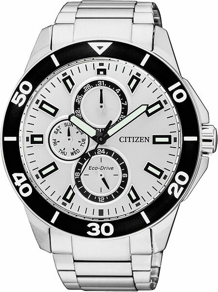Лучшие цены. Мужские кварцевые часы с приводом Eco-Drive. Система Eco-Drive не нуждается в замене батарейки и заряжается от любого источника освещения (естественный или искусственный свет). Запас энергии до 180 дней. EOL - функция индикация заряда аккумулятора. Центральные часовая, минутная и секундная стрелки. Люминесцентное покрытие стрелок и маркеров часов. Календарь: число, день недели. На отдельный малый циферблат вынесен 24х часовой формат времени. Круглый корпус выполнен из нержавеющей стали. Магазины в вашем городе.