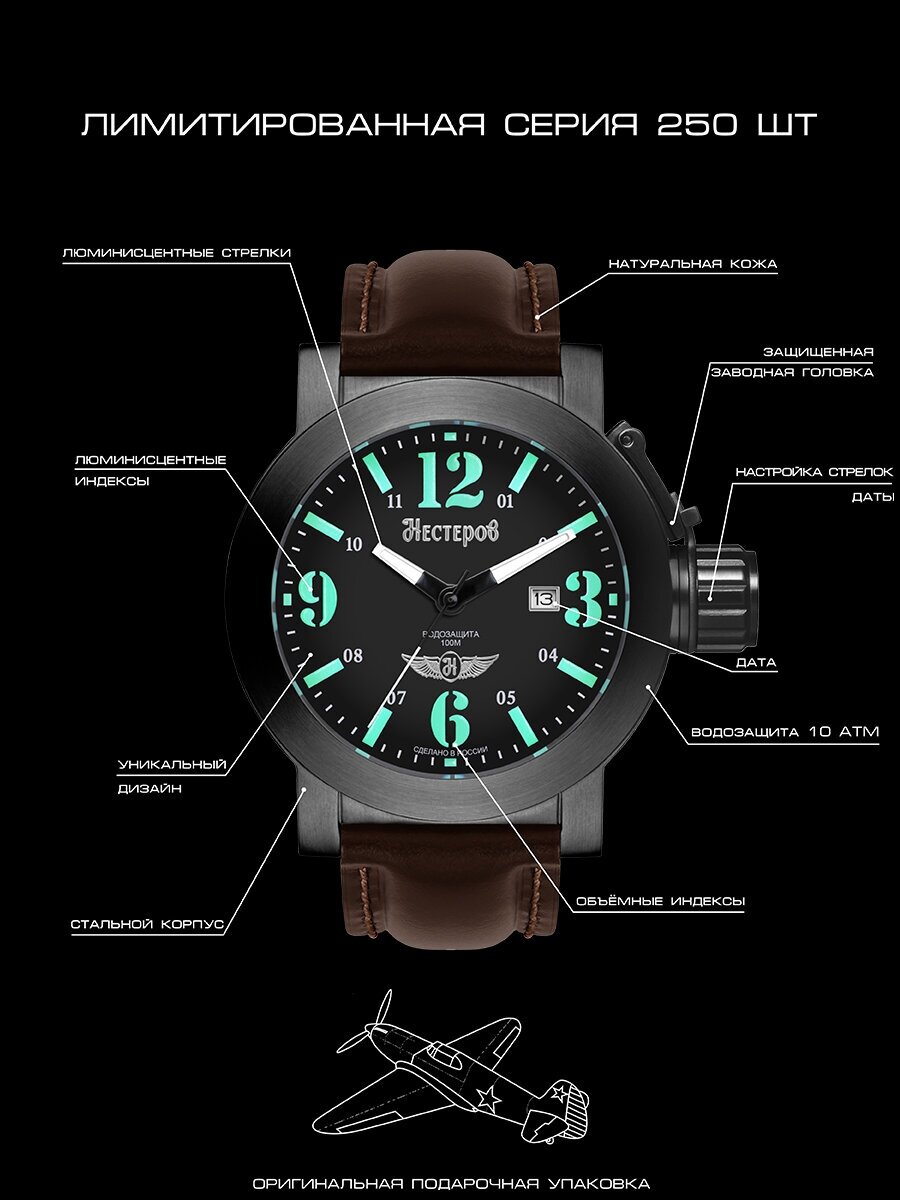 Лучшие цены. Мужские наручные часы Нестеров серии Як-3 от официального дистрибьютора. Эта серия посвящена Як-3 - советскому одномоторному самолёту-истребителю. Часы оснащены надежным японским механизмом с индикатором даты. Все часы «Нестеров» выпускаются лимитированными сериями по 75-500 экземпляров, которые посвящаются самолетам или известным летчикам и важным событиям мира авиации. На задней крышке каждых часов можно увидеть изображение самолета или портрет летчика и её порядковый номер в коллекции. Магазины в вашем городе.