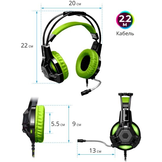 Игровая гарнитура Defender Lester черный/зеленый [50mm, 20Гц~16kГц, 32 Ом, 2.2 м]