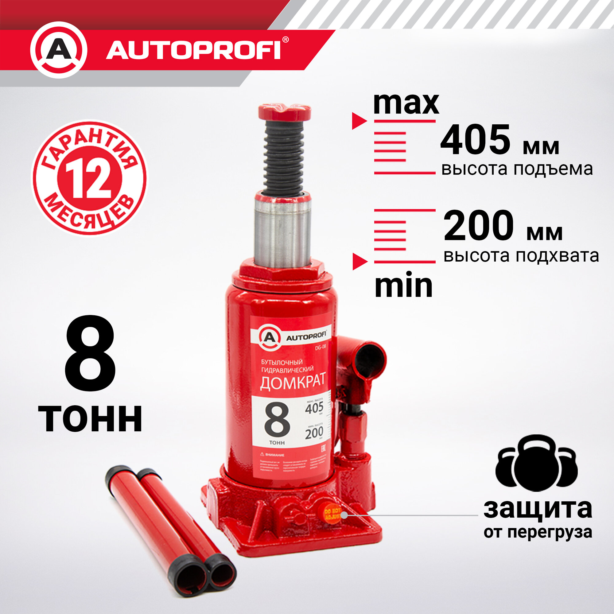 DG-08_домкрат! бутылочный гидравлический, 8 тонн, защита от перегруза, высота подъёма 200-405мм\ AUTOPROFI DG08 | цена за 1 шт