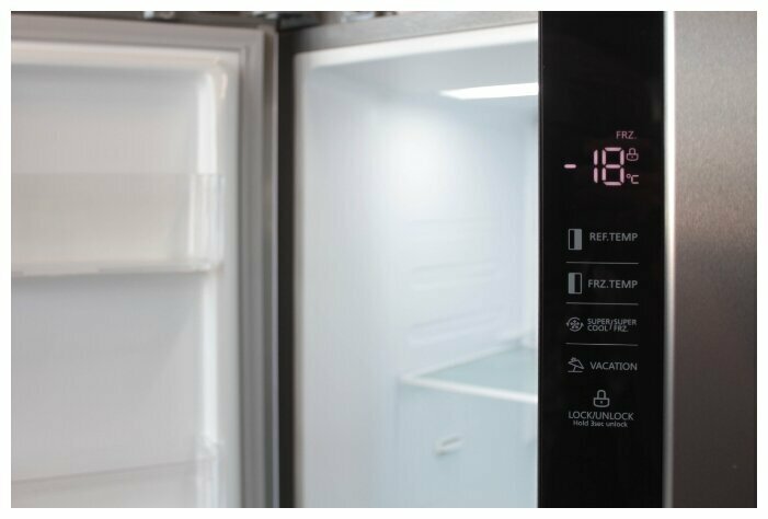 Лучшие цены. Количество компрессоров: 1.Размораживание морозильной камеры: no frost.Размораживание холодильной камеры: no frost.Морозильная камера: side by side (сбоку).Индикация открытой двери: звуковая.Защита от детей: есть.Хладагент: r600a (изобутан).Инверторный тип компрессора: да.Количество камер: 2.Количество дверей: 2.Режим «Отпуск»: есть.Стеклянные двери: да.Дисплей: есть.Дополнительные возможности: индикация температуры, суперохлаждение, суперзаморозка.Энергопотребление: 405 Вт.Класс энергопотребления: a. Магазины в вашем городе.