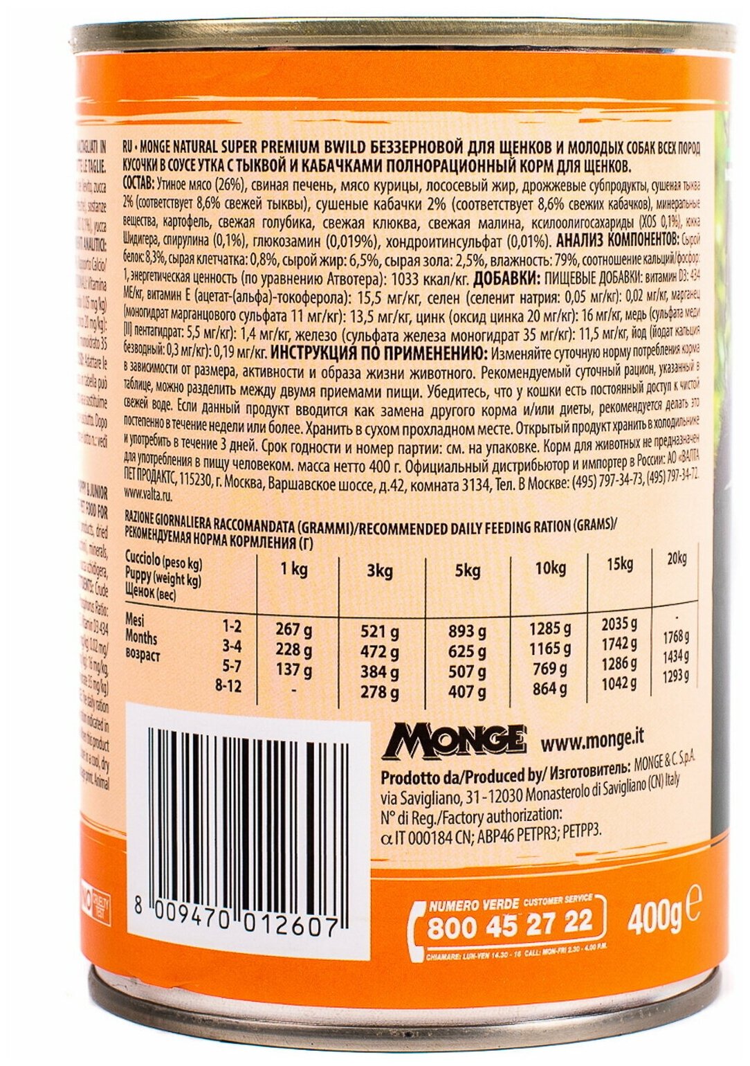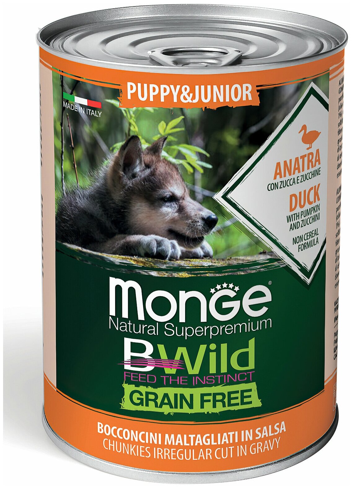 Влажный корм для щенков Monge BWILD Puppy&Junior Anatra, утка, с тыквой, с цукини, 6 шт. х 400 г