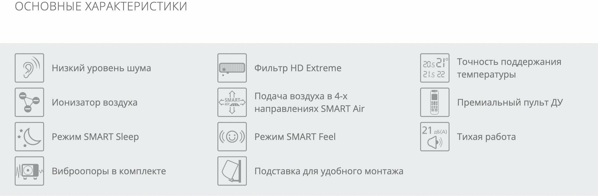 | Функции | инверторное управление / автовыбор режима работы / таймер / ночной режим / авторестарт / ионизатор / сенсор присутствия / самоочистка / самодиагностика / управление со смартфона |