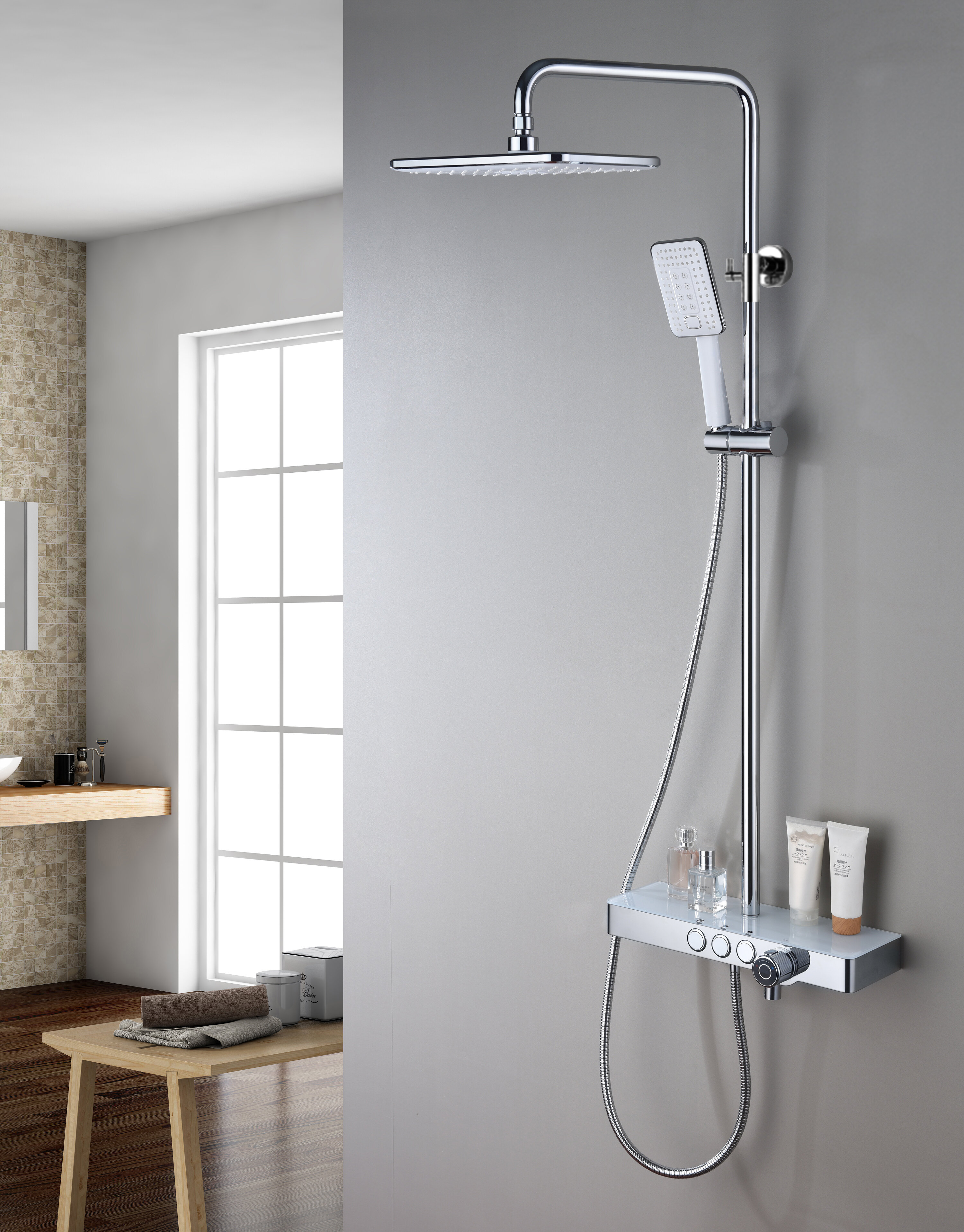 | Комплектация | ручной душ (душевая лейка) / верхний душ (тропический) / смеситель / стойка / штанга / душевой шланг / крепление ручного душа / полка (в виде верхней части смесителя) |