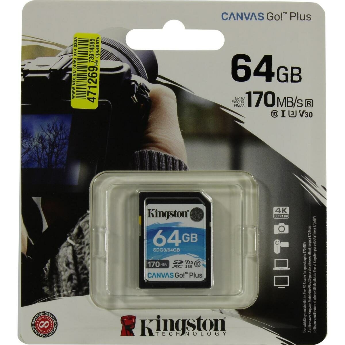Карта памяти Kingston Canvas Go Plus, SDXC, 64 гб, UHS-I U3, 170 Мб/с, класс 10 (SDG3/64GB)