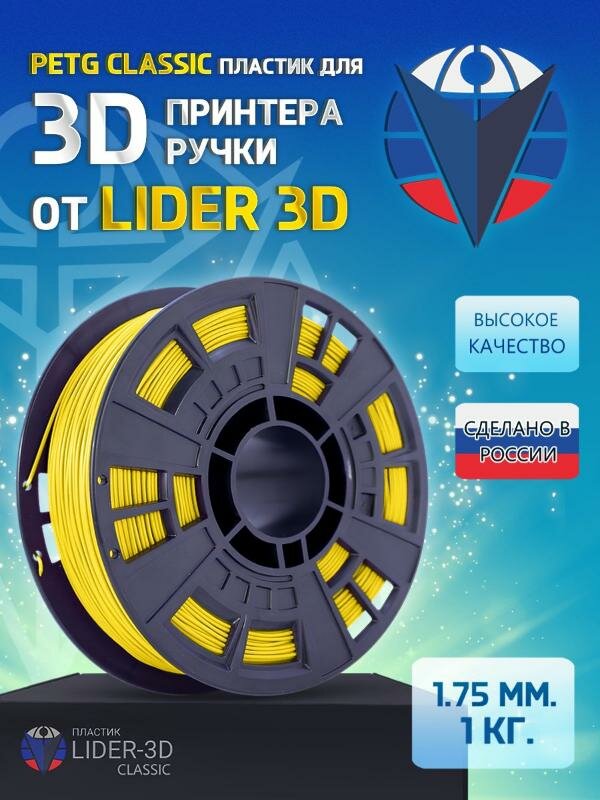 Пластик для 3D печати PETG пластик LIDER-3D Classic для 3D принтера 1.75 мм, Жёлтый, 1 кг