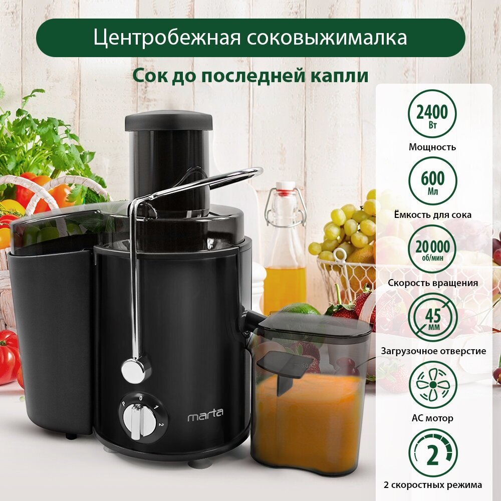 Лучшие цены. MARTA MT-2049 черный жемчуг соковыжималка Мощная двухскоростная соковыжималка с увеличенным диаметром отверстия для загрузки цельных фруктов и овощей для приготовления сока из мягких и твердых продуктов. Не требуется предварительное измельчение продуктов. Вместительный контейнер для сбора мякоти позволяет получить большое количество сока за один цикл работы. Высокая скорость вращения стальных лезвий обеспечит быстрое извлечение сока, а сетчатый фильтр из нержавеющей стали обеспечит чистоту отжима готового. Магазины в вашем городе.
