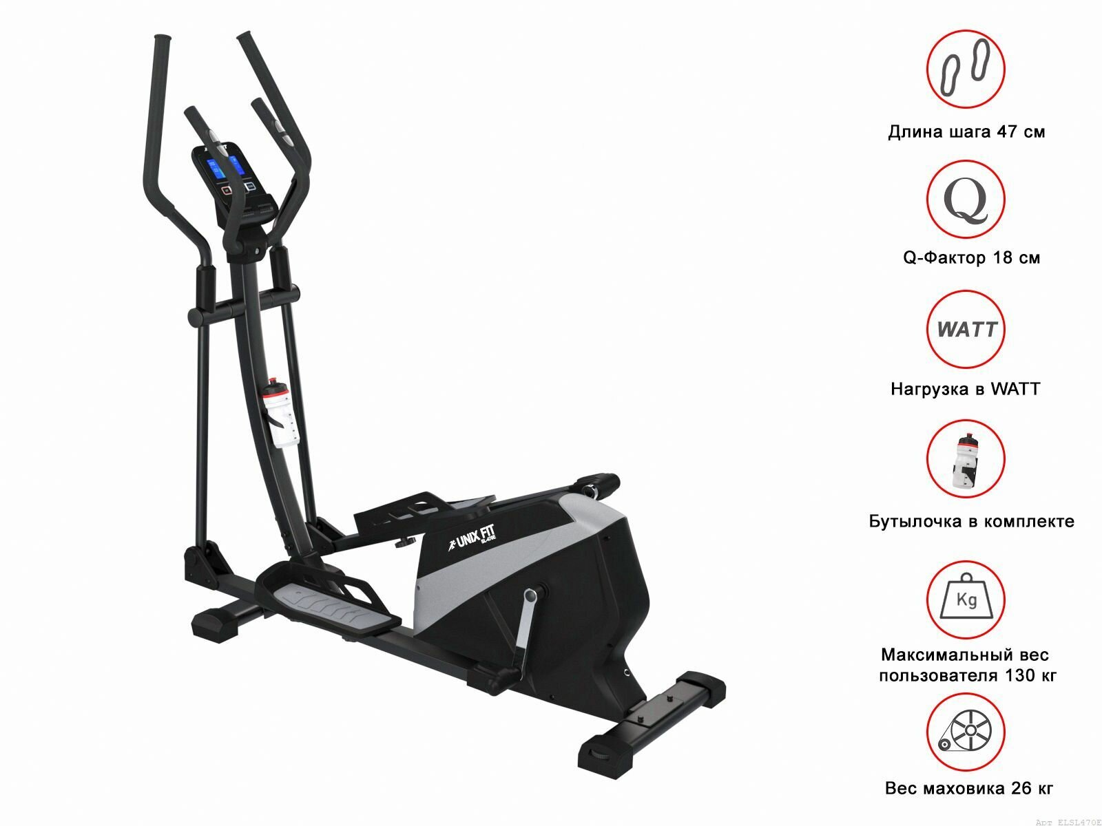 Лучшие цены. "Серия SL эллиптических тренажеров UNIXFIT – это комфорт и безопасность домашних тренировок. Увеличенный вес маховика позволяет наиболее точно выбрать необходимую нагрузку, сохраняя плавность хода педалей. Электромагнитный эллиптический тренажер UNIXFIT SL-470E обладает усиленным трехкомпонентным педальным узлом и мощной рамой. Длина шага данной модели составляет 47 сантиметров, а расстояние между педалями (Q фактор) составляет всего 18 сантиметров. Магазины в вашем городе.