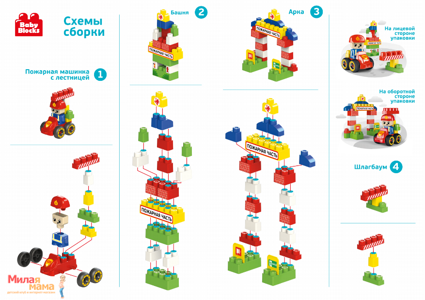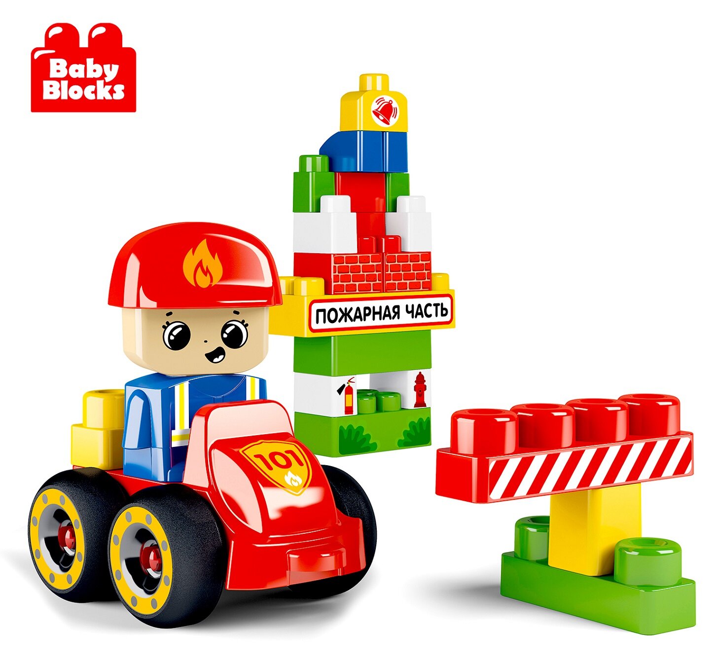 Лучшие цены. Первый конструктор для вашего малыша "Пожарная часть" с возможностью собрать машинку пожарного с лестницей. Набор содержит 35 деталей размерами от 31 х 31 х 52 мм до 167 х 70 х 103 мм. Комплект: 35 крупных, разноцветных деталей, лист с наклейками, буклет со схемами сборки пожарной башни и арки, пожарной машины с лестницей, фигурка человечка-пожарного. Магазины в вашем городе.