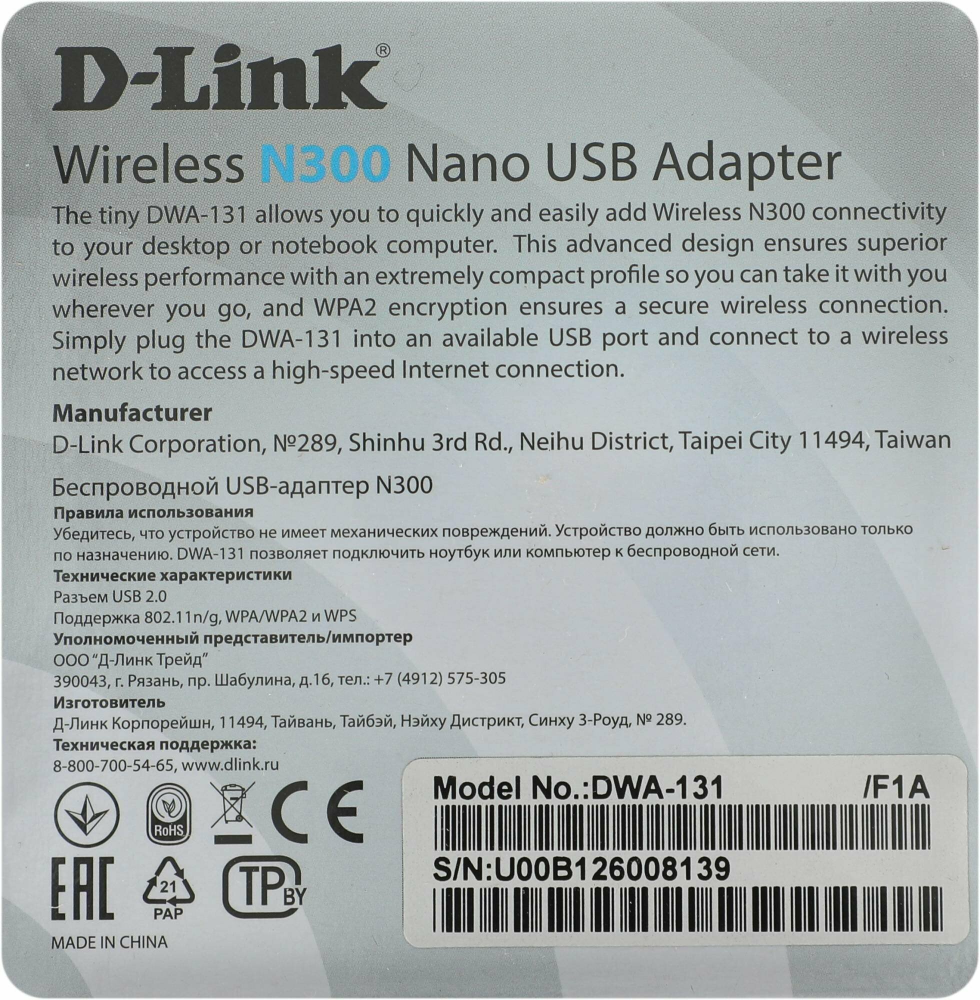 Wi-Fi адаптер D-Link (DWA-131/F1A)