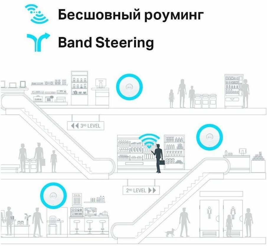 Точка доступа TP-Link 11AX dual-band ceiling access point, up to 1200 Mbit / s at 5 GHz and up to 574 Mbit / s at 2.4 GHz, 1 10/100/1000Mbps LAN port, support PoE 802.3at standard, support BSS coloring, Seamless Roaming, Mesh, Band Steering, Airtime Fairn