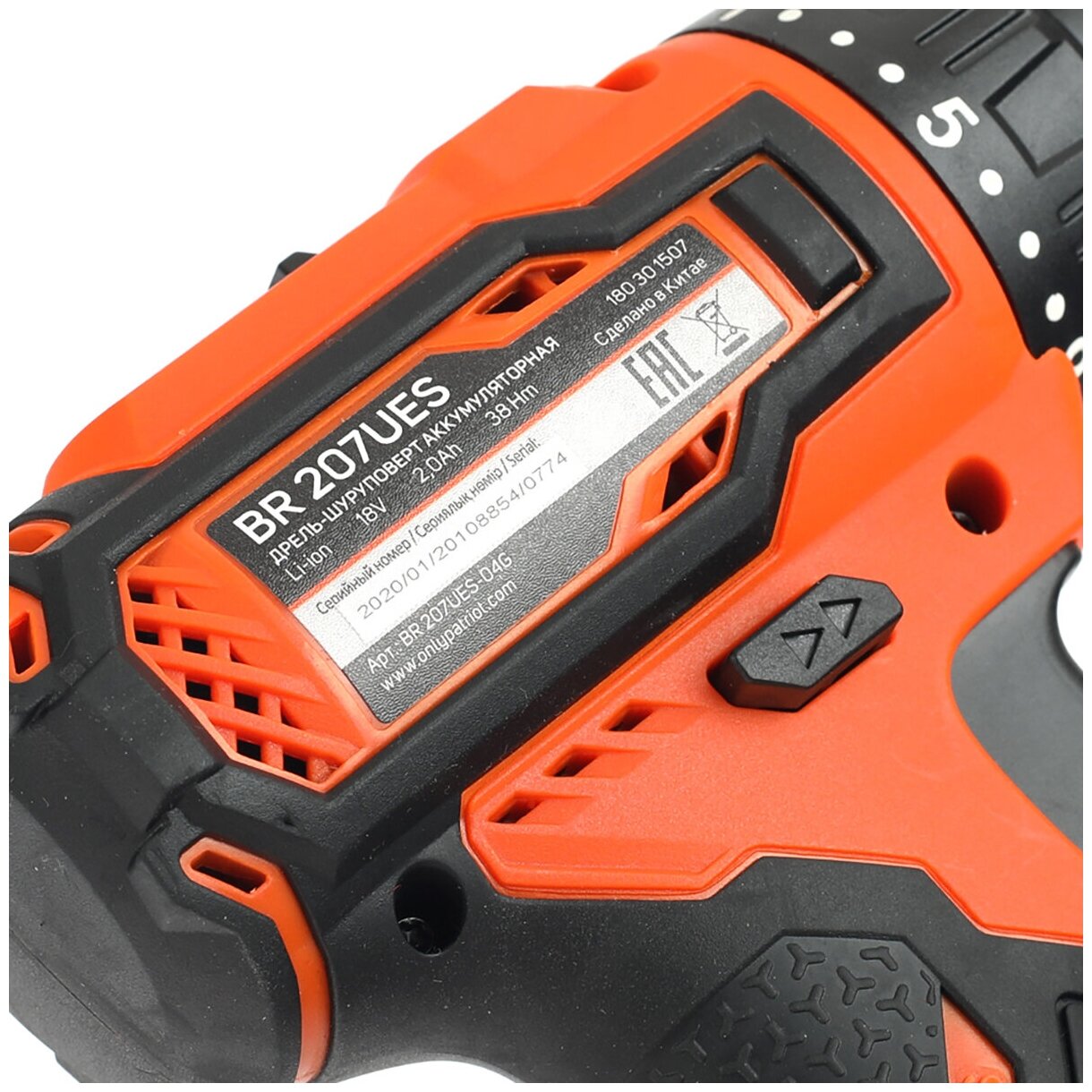 Дрель-шуруповерт аккумуляторная PATRIOT BR 207UES / 18В / 2,0Ач / 38Нм / дерево/сталь - 20мм/8мм