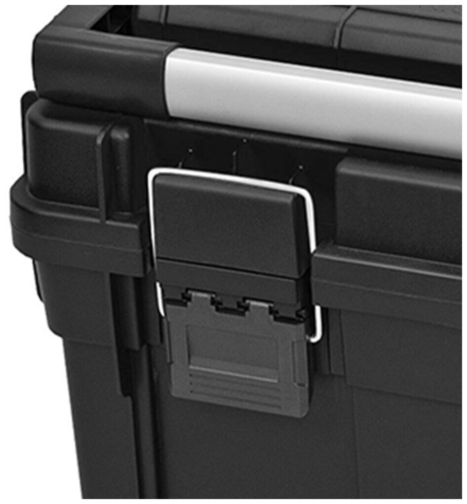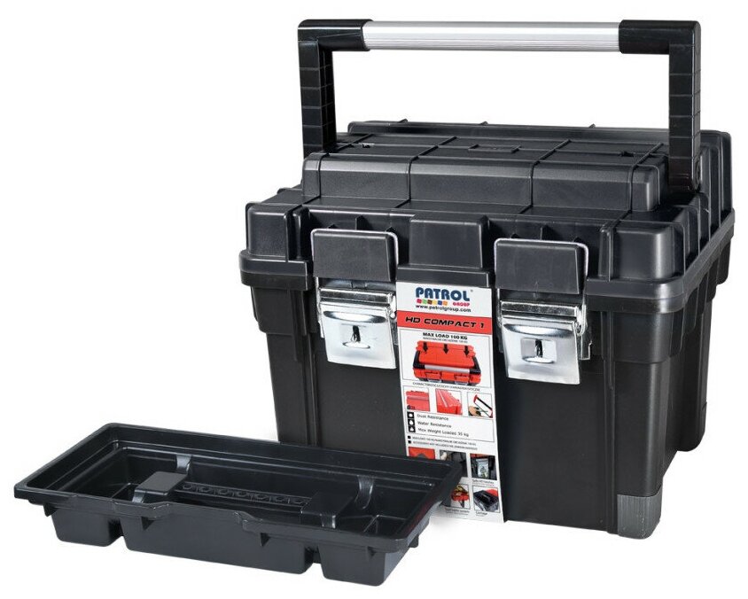 Лучшие цены. Ящик для инструментов PATROL HD Compact 1 изготовлен из высокопрочного пластика. Специальная конструкция ящика и крышки, обеспечивают пыле- и водо- непроницаемость. Полиамидные замки, устойчивые к повреждениям и коррозии. Линейка в крышке. Большая удобная алюминиевая ручка, которая так же позволяет организовать из крышки дополнительную рабочую поверхность. Антискользящие уголки. Боковые держатели в корпусе ящика. Лоток для инструментов. Грузоподъемность 35кг. Магазины в вашем городе.