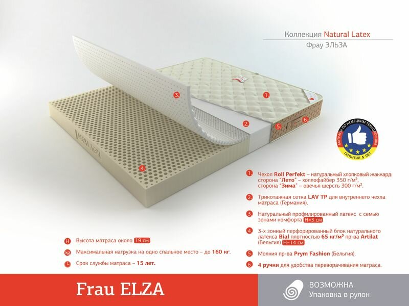 Лучшие цены. Матрас Natural Latex Frau Elza (Фрау Эльза) из комбинации 3-х зонного блока натурального латекса высотой 14 см с 7-ми зональным слоем латекса 3 см. Комбинация моноблока натурального латекса высотой 14 см и профилированного слоя латекса с микромассажным эффектом высотой 3 см. Обладает прекрасным анатомическим эффектом и высоким уровнем комфорта. Подходит для трансформируемых оснований. Магазины в вашем городе.