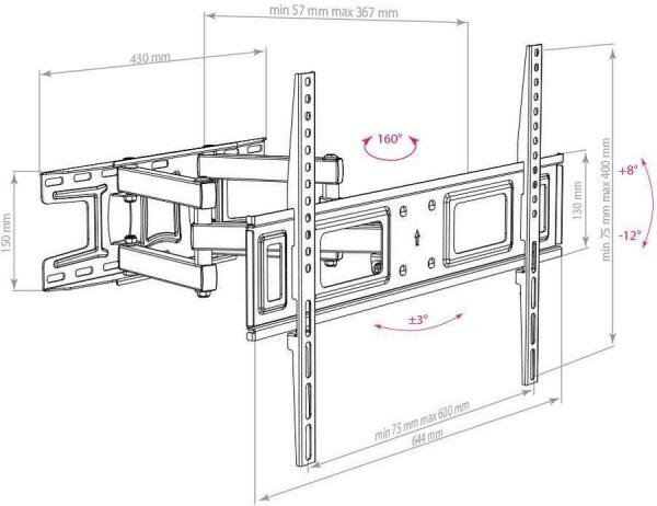 Лучшие цены. Тип установки: настенный; Регулировка: поворотно-выдвижной и наклонный; Назначение: для телевизора; Размер VESA: 100x100, 200x100, 200x200, 300x300, 400x200, 400x300, 400x400, 600x400, 300х200, 200х300; Совместим по диагонали: от 27 до 40, от 41 до 49; Угол наклона: 12; Угол поворота: 160; Расстояние от стены: 5.7- 36.7 см; Максимальная нагрузка: от 21 до 40 кг; Дополнительно: Угол наклона -12/+8 °, Угол поворота 160 °, Диагональ 32-65", Максимальный вес телевизора 35 кг, Расстояние от стены/потолка (мин). Магазины в вашем городе.