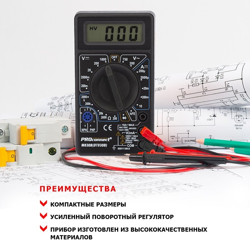 Лучшие цены. Мультиметр портативный PROconnect "M830B(DT830B)" - электроизмерительный прибор, который включает в себя несколько функций и набор измеряемых параметров. Измеряет постоянное и переменное напряжение, постоянный ток и сопротивление в цепи. А так же с помощью данного прибора можно проводить тестирование диодов. Прибор является портативным мультиметром, компактные размеры позволяют всегда носить его с собой. Магазины в вашем городе.