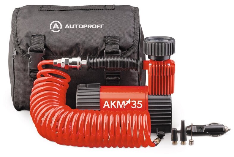 Компрессор воздушный AUTOPROFI AKM-35, 35 л./мин., 12V/14A, 180W, 10 Атм., съемный шланг 5 м., кабель питания 3 м., питание от прикуривателя, сумка, набор из 3-х переходников