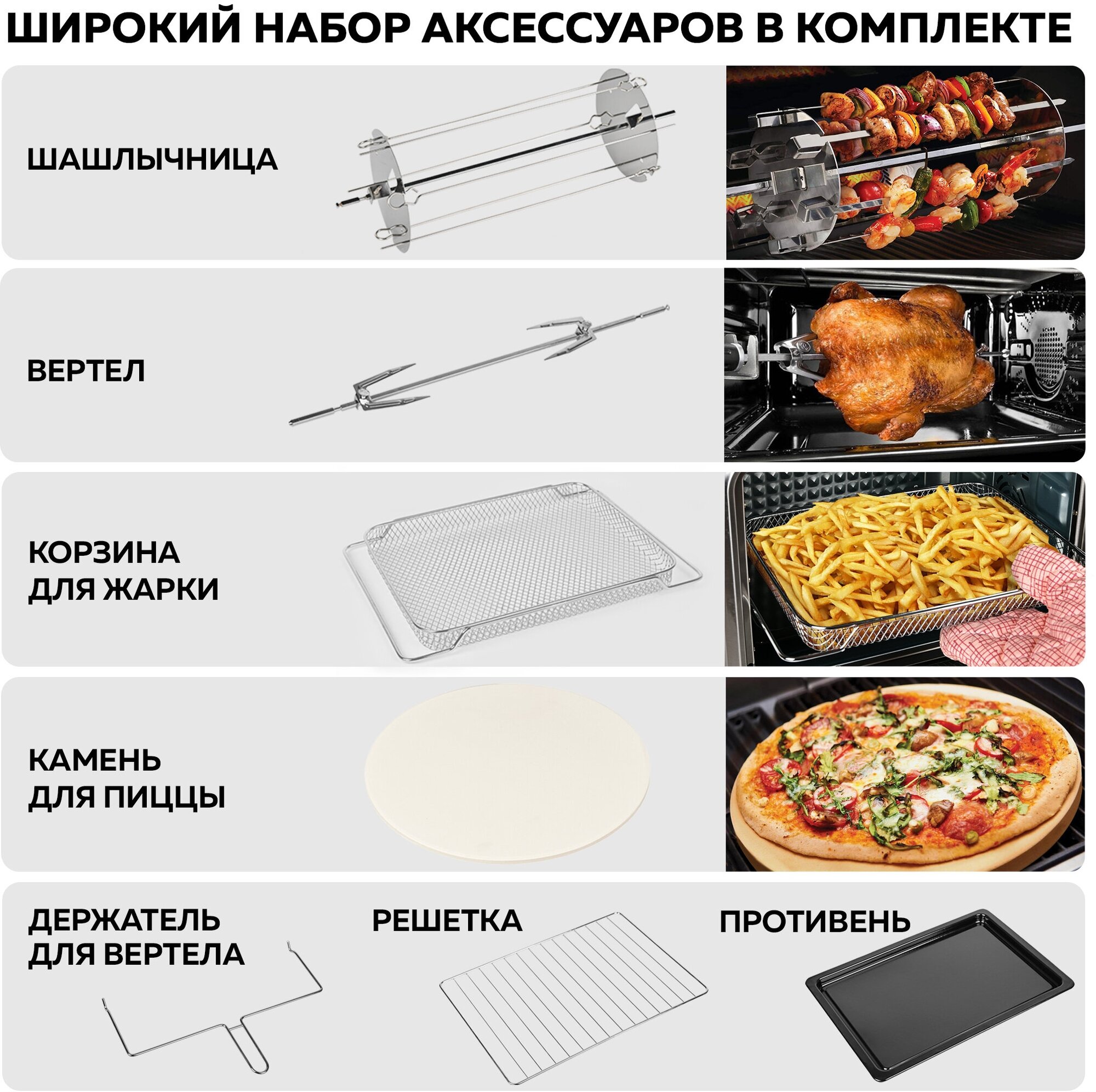 Многофункциональная мини-печь GFGRIL GFAO-700 с функцией аэрогриля, шашлычницей, вертелом для гриля и камнем для пиццы