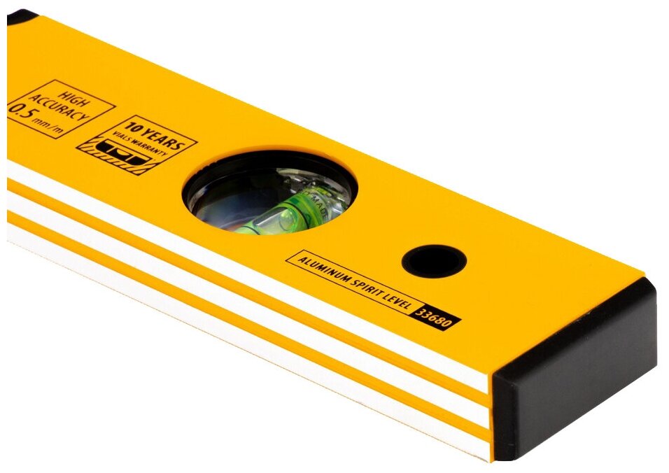 Лучшие цены. • Пузырьковые уровни Denzel предназначены для определения отклонения поверхности от вертикального или горизонтального положения. • Оснащены тремя пузырьковыми ампулами (вертикаль - 2, горизонталь — 1). • Каждая ампула защищена дополнительными стенками из поликарбоната, что увеличивает ударопрочные свойства. • Для уменьшения погрешности базовая поверхность уровня фрезерована. • Точность уровня 0,5 мм/м. • При установке пузырьковых ампул используется электронный контроль точности. Магазины в вашем городе.