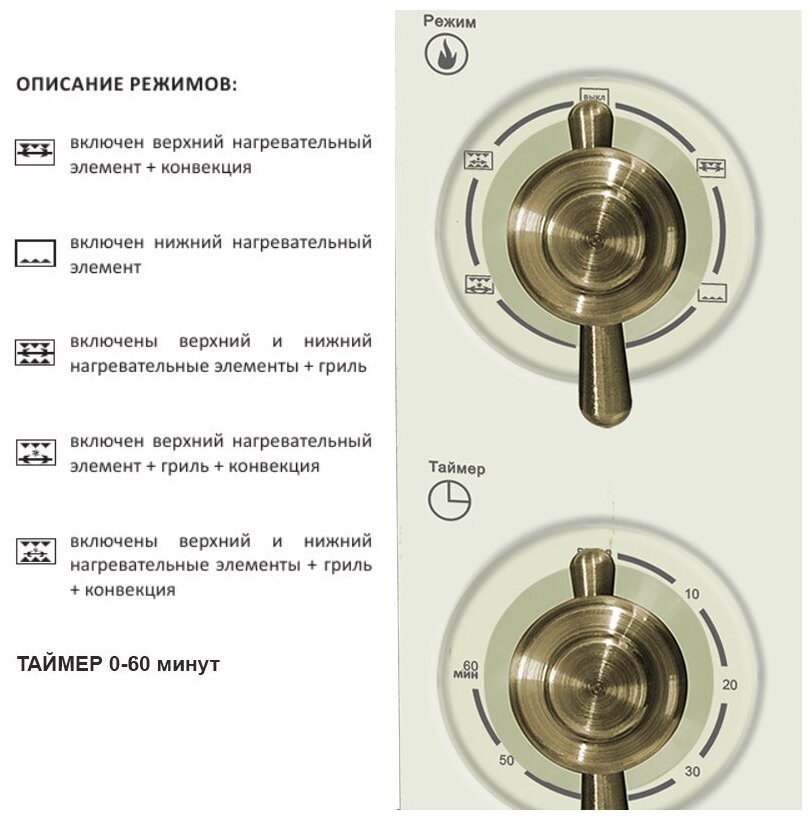 | Функции и возможности | гриль, конвекция, вертел, таймер, автоматическое отключение |
