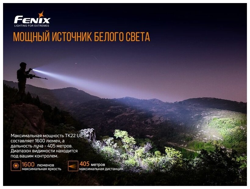 Лучшие цены. Fenix TK22UE — это ультимативное решение для охотников и любителей страйкбола. Он светит с яркостью до 1600 люмен на дистанцию до 405 м. Прочный корпус из алюминиевого сплава А6061-Т6 с IP68 убережет фонарь от любых повреждений. В комплекте с Fenix TK22UE вы найдёте: аккумулятор на 5000 мАч (21700), кабель для зарядки (USB Type-C), клипсу, ремешок на руку, чехол, запасное уплотнительное кольцо, переходник ALF-18 (на аккумы 18650) и гарантийный талон на 5 лет. Магазины в вашем городе.