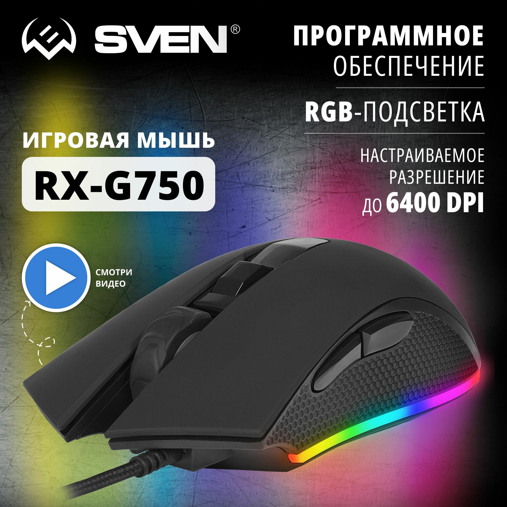Мышь проводная Sven RX-G750, 6400 dpi, USB, черный (SV-019198)