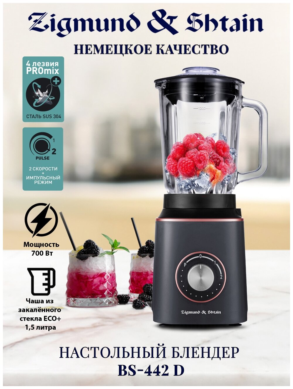 Лучшие цены. Настольный блендер Zigmund & Shtain BS-442D - многофункциональный кухонный прибор. Выполняет функции блендера, измеличителя и миксера. Быстро и качественно измельчает, взбивает, смешивает любые продукты, готовит молочные и фруктовые коктейли, смузи, различные десерты, соусы, супы-пюре и многое другое. Очень полезным будет блендер для молодых мам: позволит приготовить разнообразные блюда детского питания, за считанные секунды доведет их до нежнейшего пюреобразного состояния. Магазины в вашем городе.