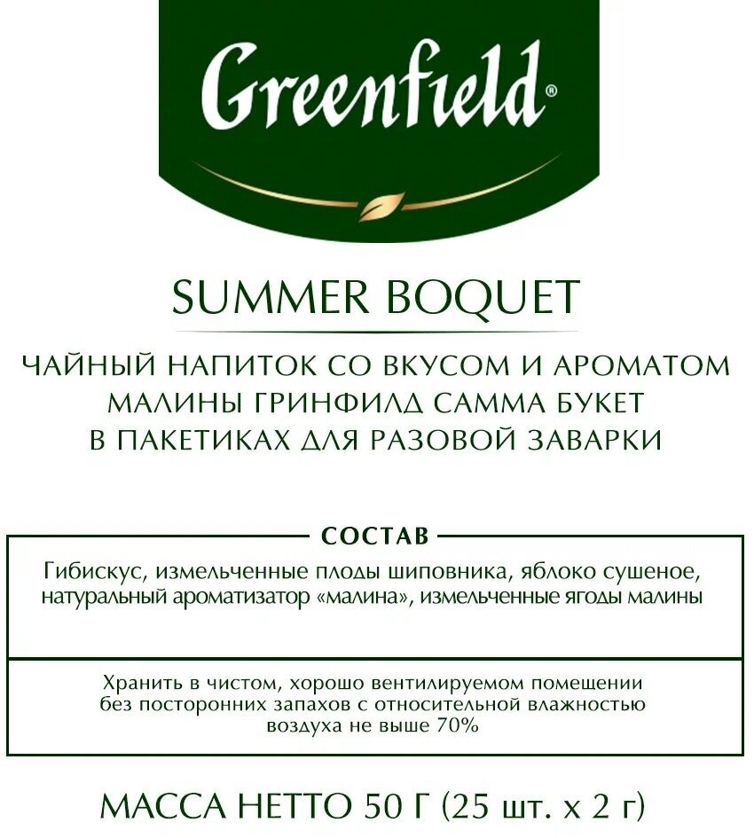 Чай GREENFIELD (Гринфилд) "Summer Bouquet", фруктовый (малина, шиповник), 25 пакетиков в конвертах по 1.5 г, 0433