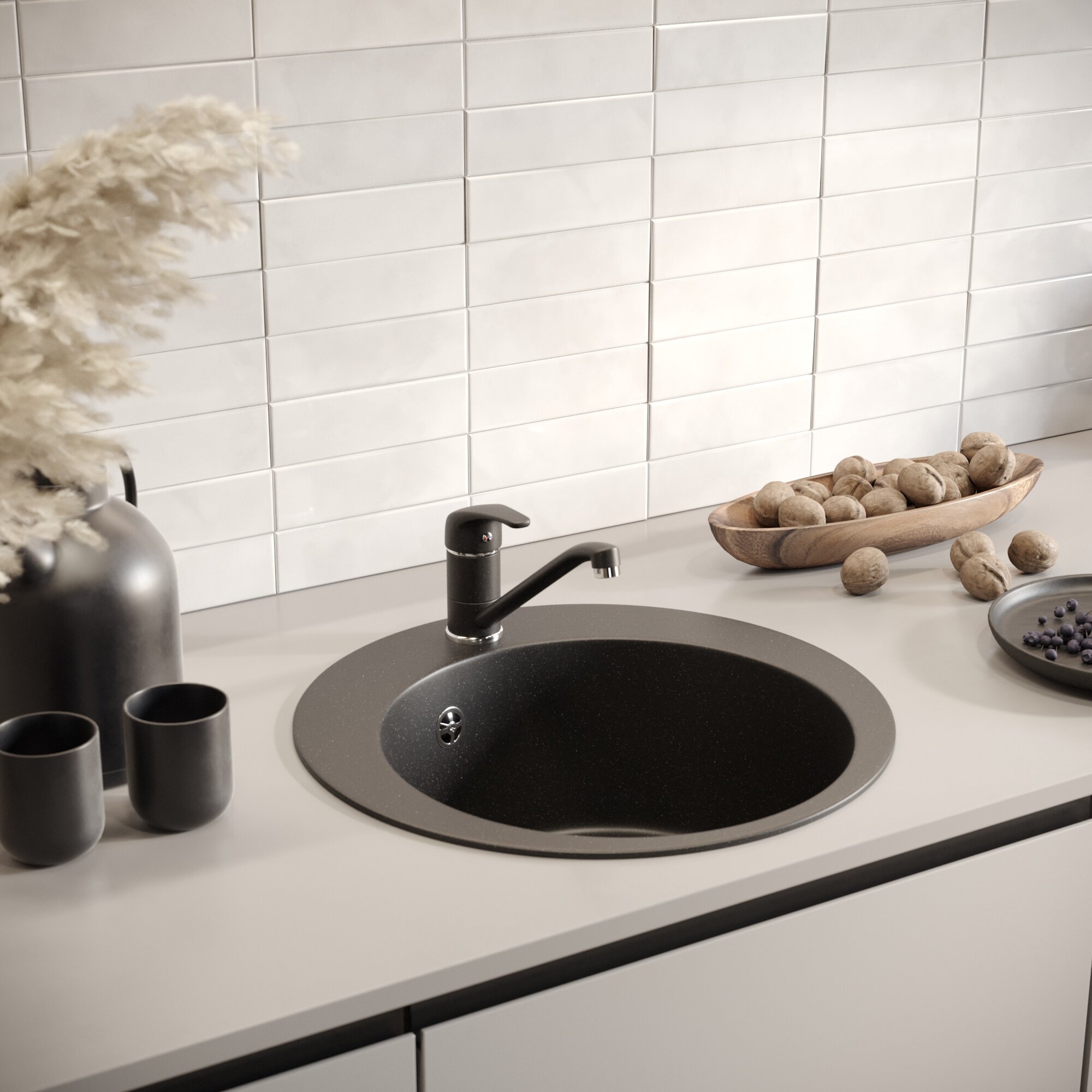 Кухонная мойка Мойка кухонная Domaci Солерно EMQ-1475.C черная, 37х37 см, круглая, кварцевая, встраиваемая
