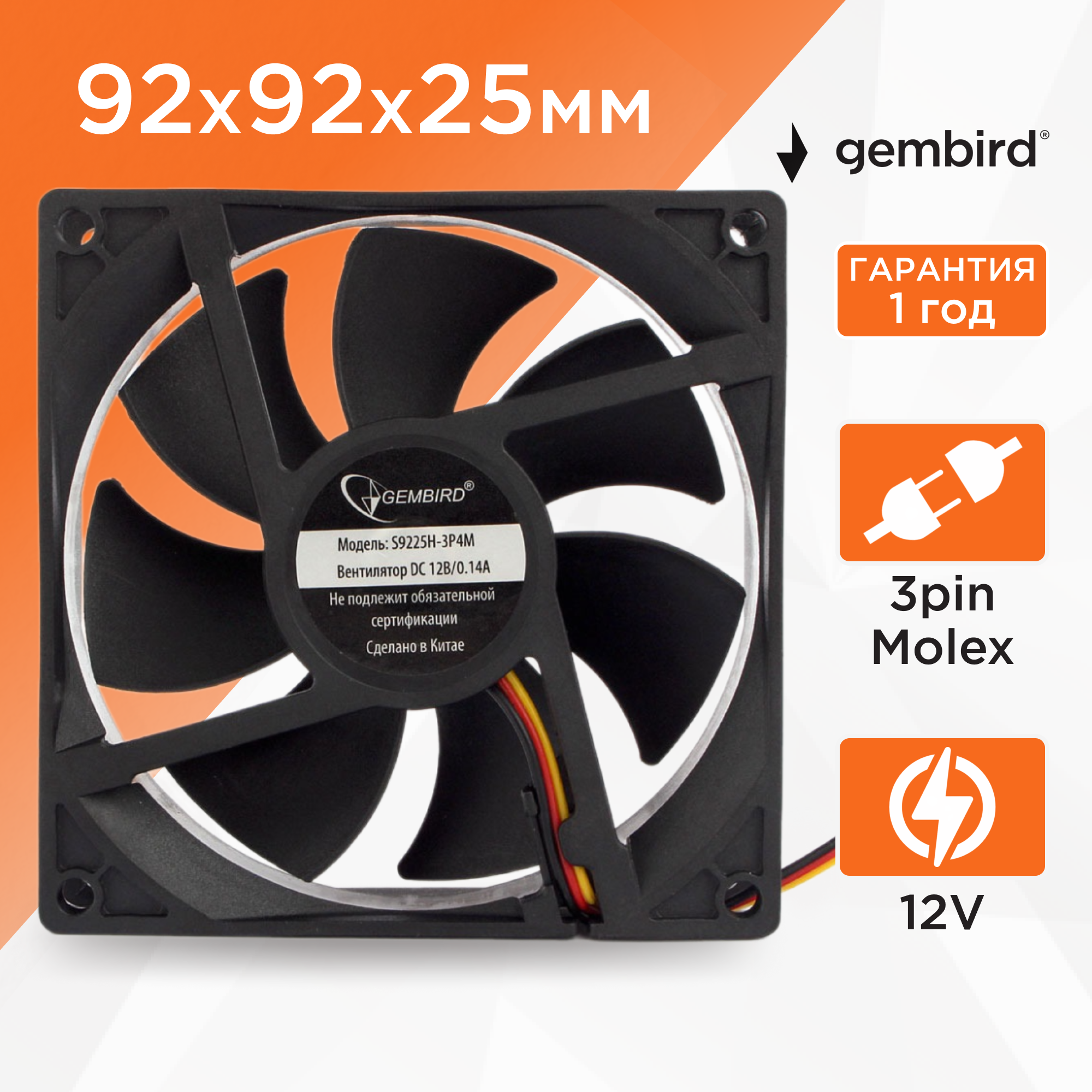 Вентилятор 12в 92 x 25мм Gembird S9225H-3P4M 12V 0.14А гидродинамический 3pin+Molex 30см 2000 об*мин тихий