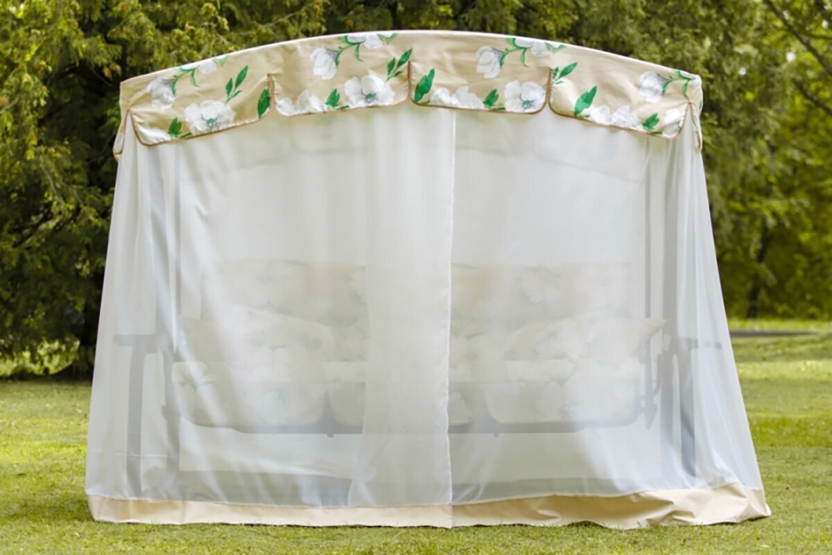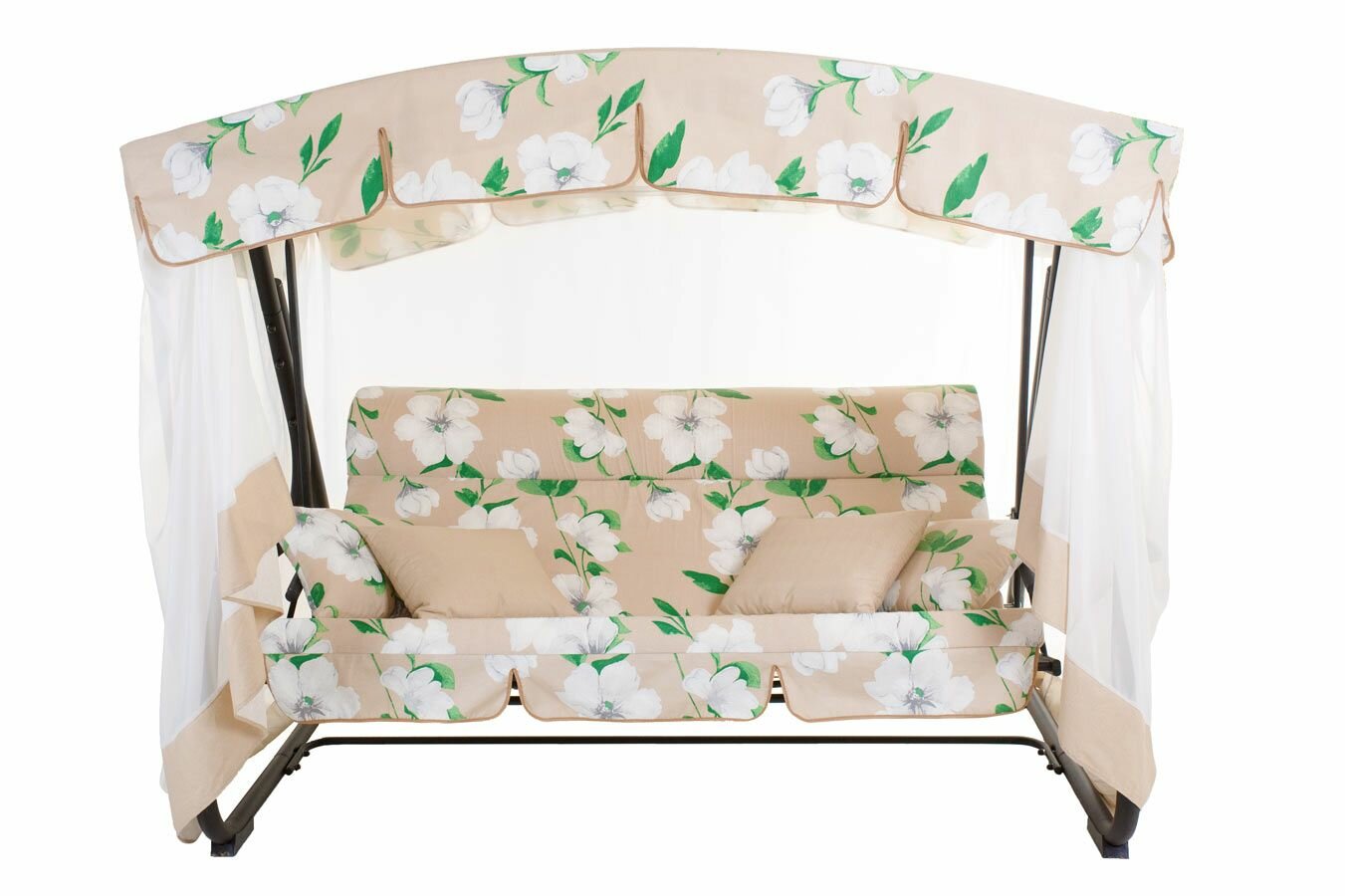 Садовая качель Качели садовые 3-х местные Мебельторг Турин Премиум FLOWER Каркас черный/Бежевый, белый рис.цветы