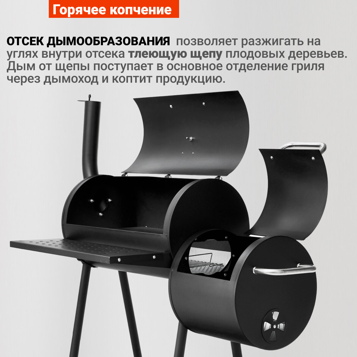 | Дополнительно | решетка, доп. рабочая поверхность, крышка, термометр, подставка для продуктов, место для дров/баллона, дымоходная труба, система очистки днища от золы, колеса для транспортировки |