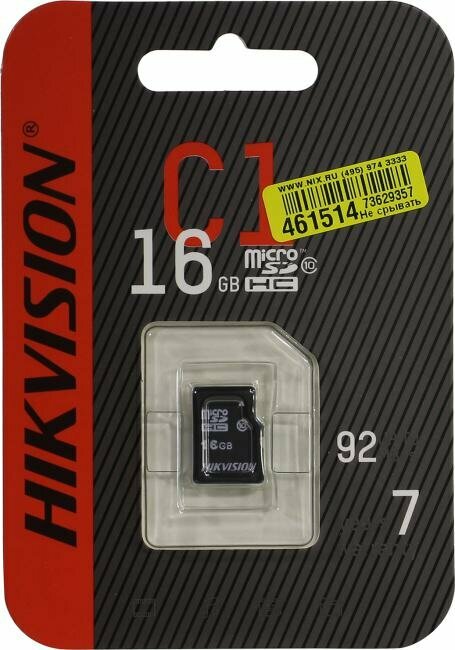 Карта памяти MicroSD 16Гб Hikvision HS-TF-C1(STD)/16G/Adapter