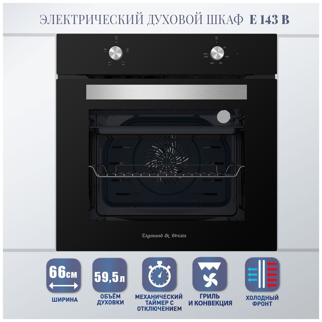 Лучшие цены. Электрический независимый духовой шкаф Zigmund & Shtain E 143 B Особенности: 5 уровней готовки Гриль есть Конвекция есть Переключатели поворотные Очистка духовки: эмаль легкой очистки Тангенциальное охлаждение есть Двойное стекло дверцы есть, съёмные Панорамное внутреннее стекло Smart Eye Холодный фронт есть Лампа подсветки 15 Вт Функции: Верхний, нижний нагреватель и вентилятор Верхний нагреватель Нижний нагреватель Гриль Характеристики: Объем, л 66 Класс энергопотребления: А Максимальная мощность, Вт 2650. Магазины в вашем городе.