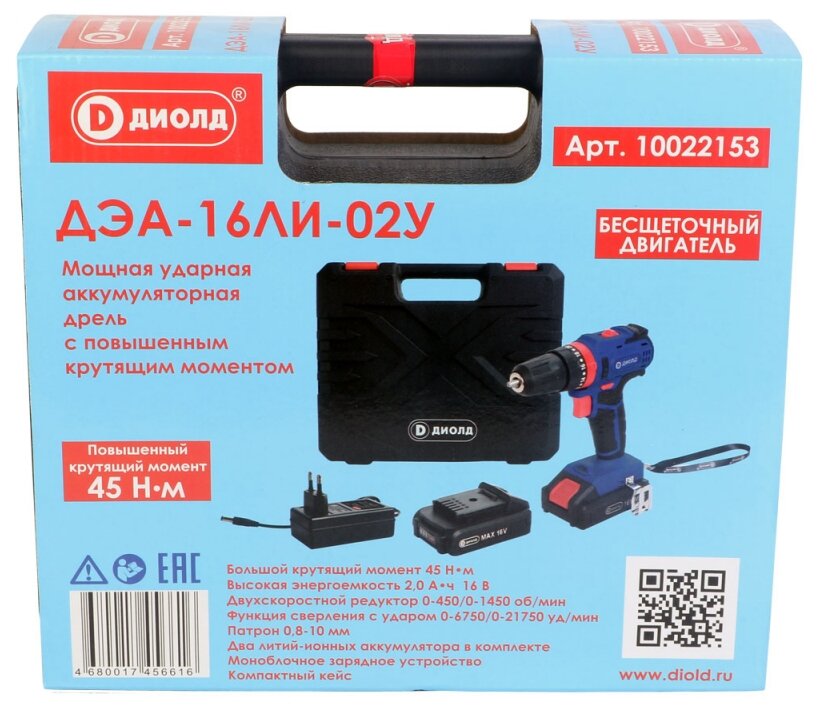 Дрель-шуруповерт ударная аккумуляторная диолд ДЭА-16ЛИ-02У, 16В, 45 Нм, бесщеточный двигатель, 2Li-ion АКБ, кейс, 0-1450 об/мин