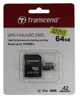Карта памяти Transcend 64GB microSDXC Class 10 UHS-I U3 V30 A2 (TS64GUSD330S)