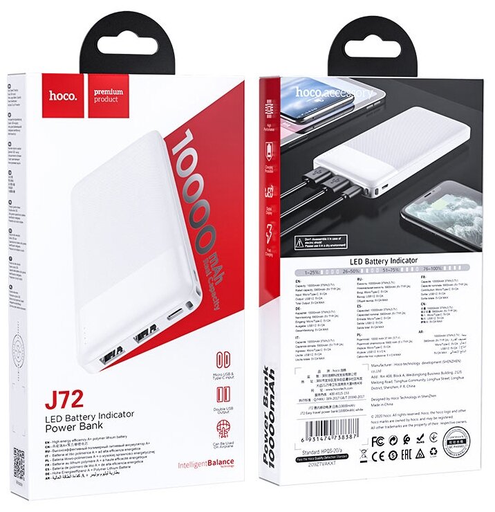 Универсальный Доп. Аккумулятор 10000mAh, J72, HOCO, 2 USB (5V/2.0A), белый