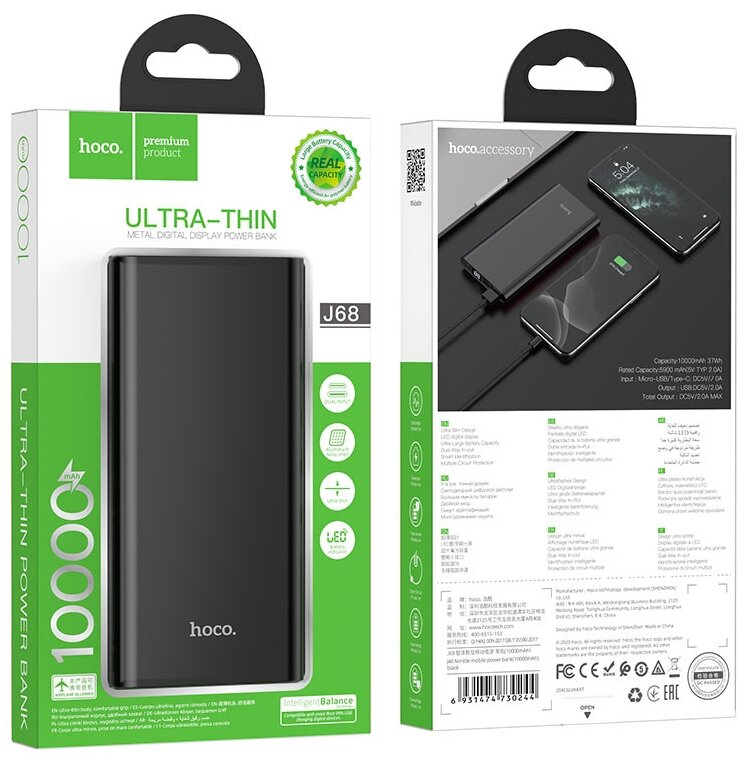 Портативный аккумулятор Hoco J68 Resourceful, 5V, 2.0A, 10000mAh, черный