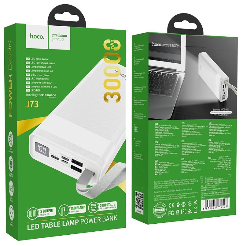 Лучшие цены. Артикул № 814115 J73 Powerful - портативный аккумулятор емкостью 30000mAh с настольной лампой. Оснащенм входами Micro-USB, Type-C и Lightning вход, а также двумя USB 2A выходами. LED цифровой дисплей отображает уровень заряда. Аккумулятор имеет удобную ручку для перености. Магазины в вашем городе.