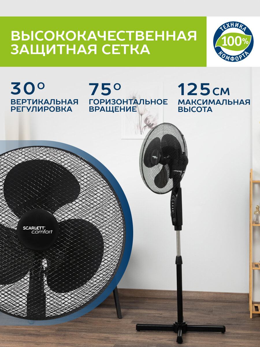 Вентилятор напольный Scarlett SC-SF111RC09 черный, мощность 45Вт, диаметр лопастей 40см, количество скоростей 3