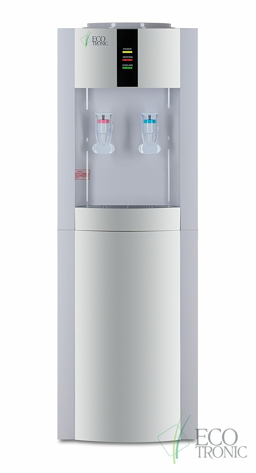Лучшие цены. Кулер для воды с верхней загрузкой бутыли и компрессорным охлаждением Ecotronic H1-LF White с холодильником. Недорогая, но качественная модель. Кулер для воды имеет два крана подачи воды: горячей и холодной, тип кранов подачи воды - push(нажим кружкой). Светодиодная индикация режимов нагрева и охлаждения воды и также отсутствия воды в бутылке. Передняя панель кулера белого цвета, с серебристыми вставками, остальные части корпуса белые. Примечание: Держатель стаканов в комплект не входит. Магазины в вашем городе.