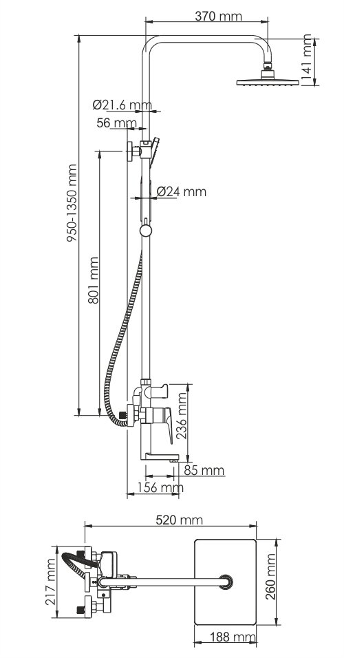 | Комплектация | ручной душ (душевая лейка) / верхний душ (тропический) / смеситель / стойка / штанга / душевой шланг / крепление ручного душа |
