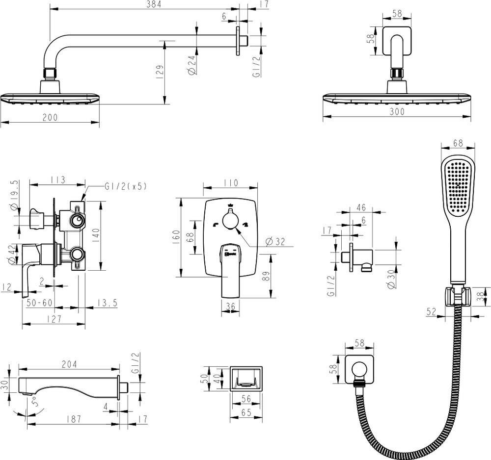 | Комплектация | ручной душ (душевая лейка) / верхний душ (тропический) / смеситель / излив / душевой шланг / крепление ручного душа / настенный кронштейн |