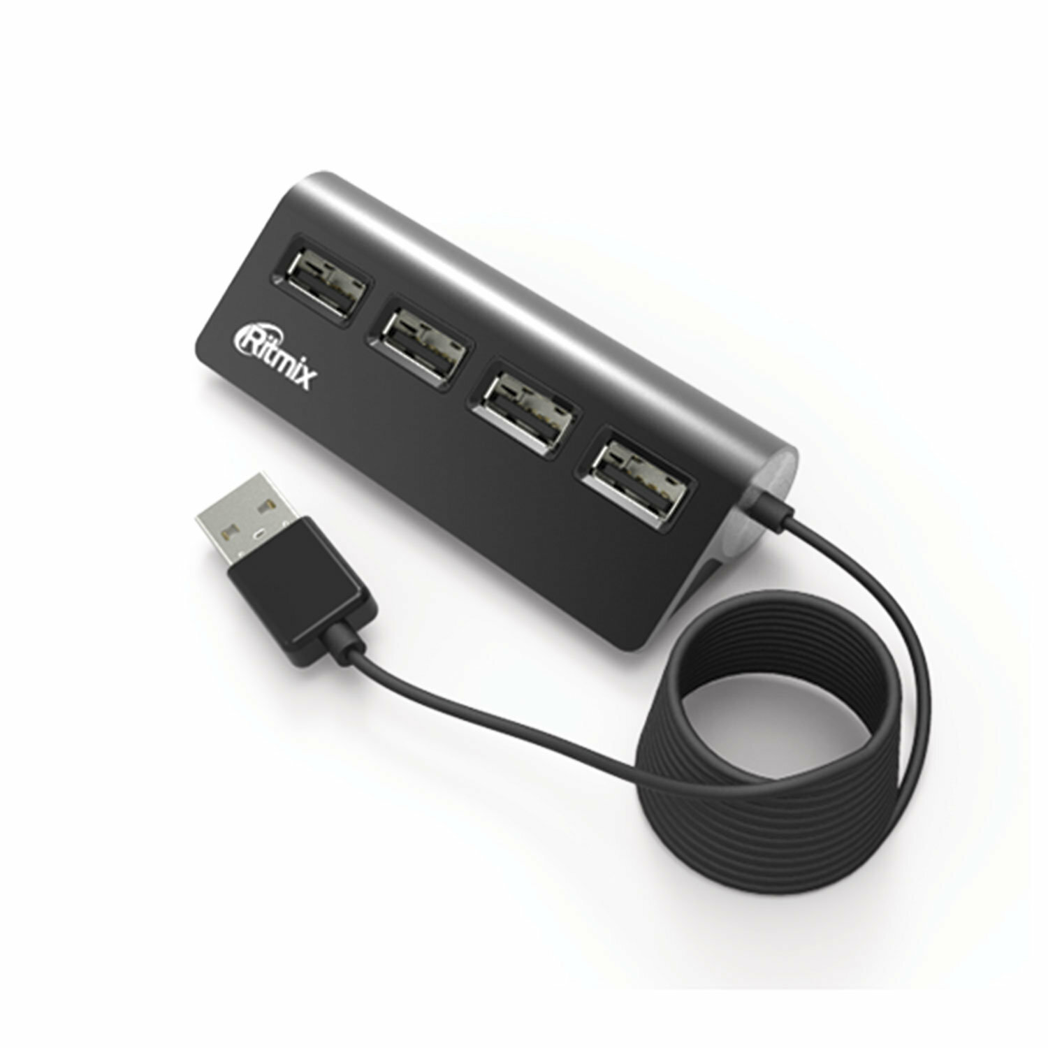 USB-HUB RITMIX CR-2400, черный, USB 2.0, 4 порта. Подключение к компьютеру/ноутбуку, питание по USB. Высокая скорость передачи данных до 480 Мбит/с. Прочный алюминиевый корпус.. Нескользящее основание. Встроенный кабель длиной один метр. USB-штекер с держ