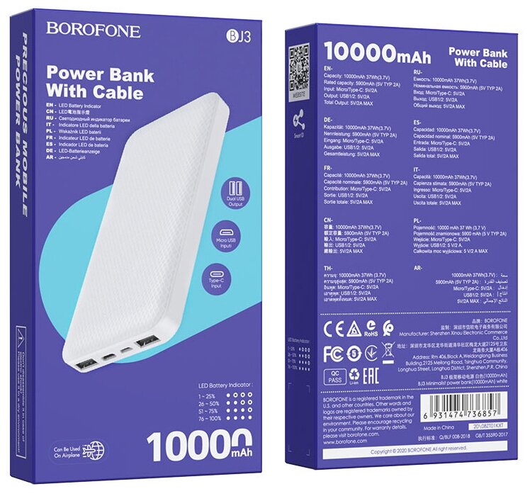 Портативный аккумулятор Borofone BJ3 Minimalist 10000mAh, вх.: Micro-USB/USB-C, вых.: 2 x USB-Af, LED, белый 1 905 ₽ Подробнее