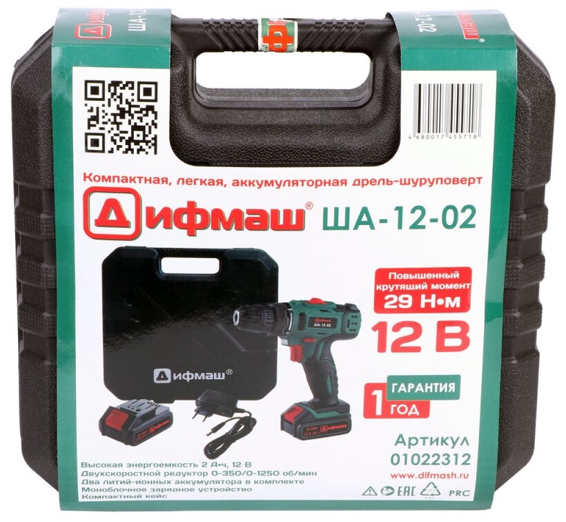 Шуруповерт аккумуляторный дифмаш ША-12-02 (дрель-шуруповерт), 12 В, 29 Нм, 2 Li-ion АКБ, реверс, ЗУ, кейс