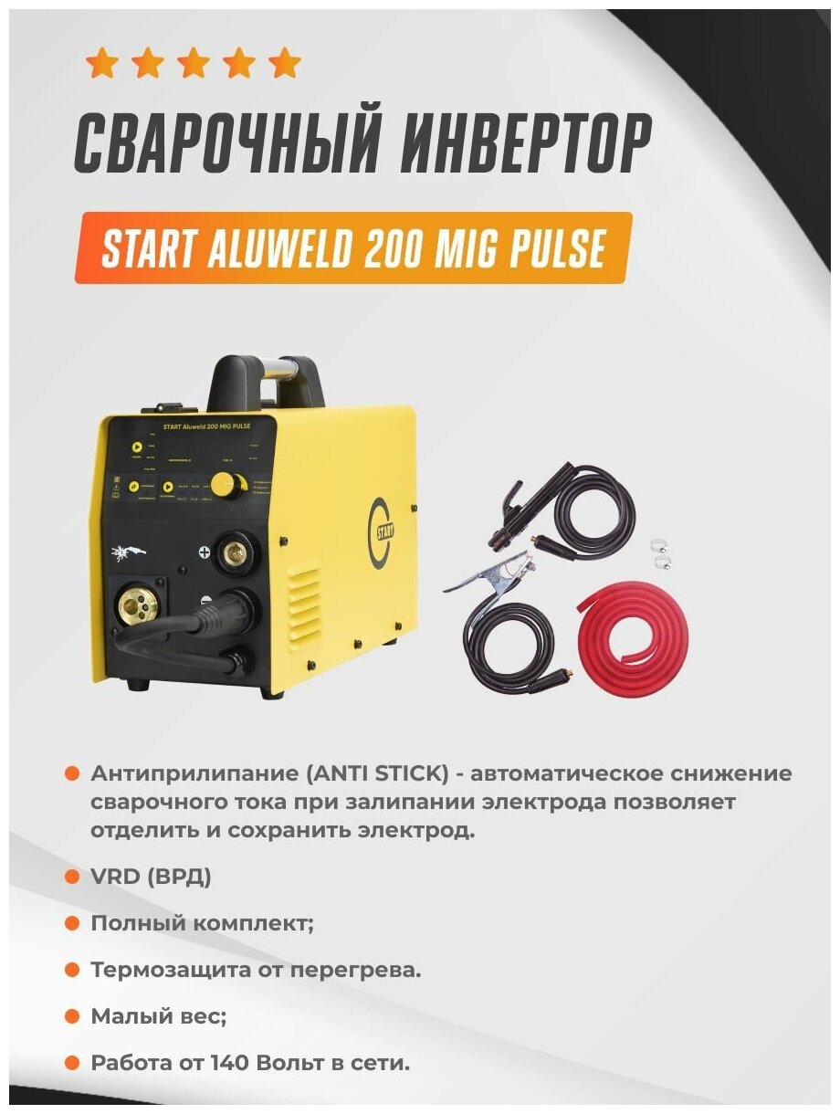 Лучшие цены. Инверторный сварочный полуавтомат START ALUWELD 200 MIG PULSE - Cварочный полуавтомат с импульсным режимом. Аппарат имеет синергетическое управление, что значительно облегчает его настройку и использование. Прочный корпус, металлический подающий механизм и интуитивно понятная панель аппарата в сочетании с доступной стоимостью делают данную модель одной из самых привлекательных в своем классе.. С помощью сварочного инвертора START ALUWELD 200 MIG PULSE можно сваривать следующие виды металлов: углеродистая. Магазины в вашем городе.