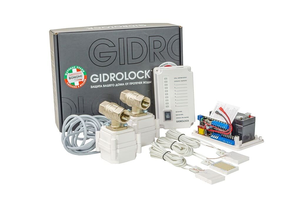 Лучшие цены. Комплект GIDROLOCK Premium BONOMI 1/2" (Dy15) (для квартиры) предназначен для перекрытия подачи воды при аварии. Срок гарантии комплекта составляет - 6лет. Команду на перекрытие подает блок управления, который, в свою очередь, получает сигнал о потопе от датчиков, устанавливаемых в местах, где наиболее вероятно возникновение аварийной ситуации. Два шаровых электропривода устанавливаются на трубы холодной и горячей воды. Магазины в вашем городе.
