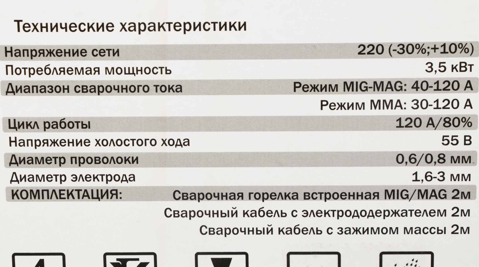 Лучшие цены. Артикул № 405240 Компактный инверторный полуавтомат MIG/MAG с максимальной потребляемой мощностью 3,7 кВт. Работает от электросети с напряжением 220 (-30%;+10%) В. Диапазон сварочного тока 30-120 А (MMA), 40-120 А (MIG/MAG). Работает с электродами диаметром от 1.6 до 3 мм. Диаметр сварочной проволоки от 0.6 до 0.8 мм. Аппарат оснащен функциями «АRC FORCE», «HOT START», «ANTI-STICK». Панель управления имеет защитный экран. Корпус изготовлен из прочных материалов и обладает ручкой для переноски. Магазины в вашем городе.